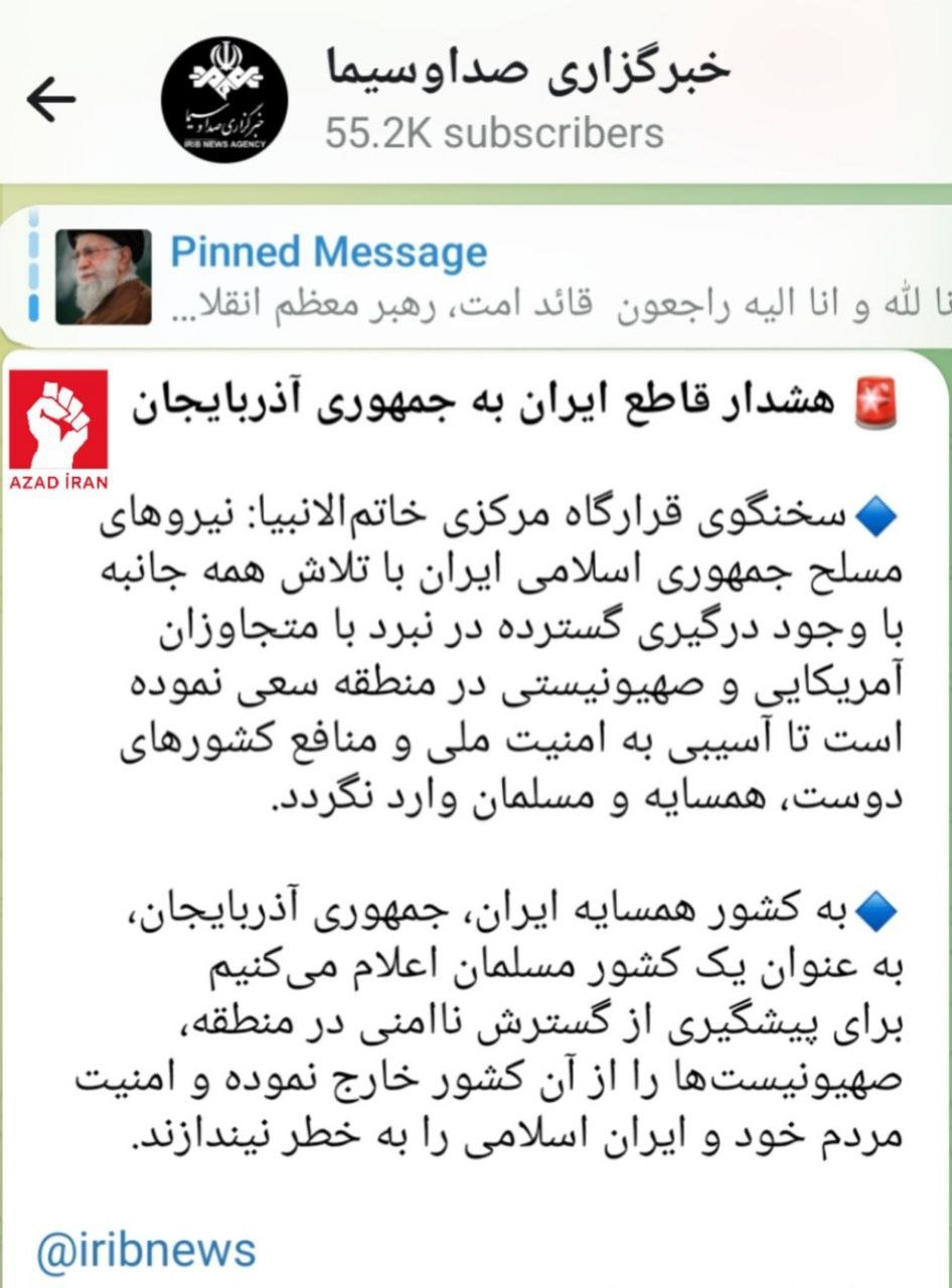 SEPAH Azərbaycana böhtan ataraq hədələyib.“Qanunyolutv.az”, “Azad İran” teleqram kanalına istinadən xəbər verir ki, məlumat İran Dövlət Televiziyasının teleqram kanalında yerləşdirilib.