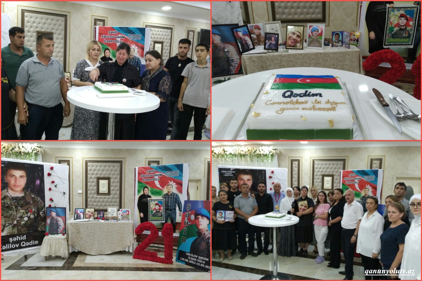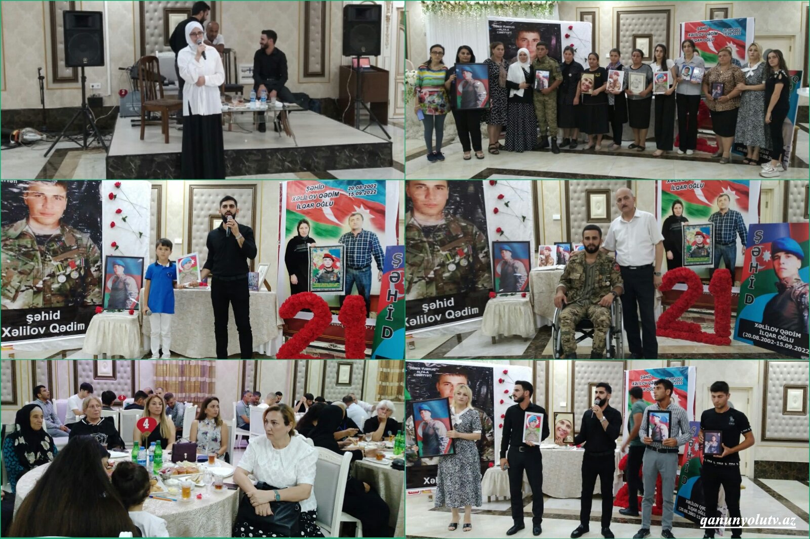 Avqustun 17-də "Xudafərin" şadlıq sarayında "Dəmir Yumruq" Alfa-a cəmiyyətinin sədri həmişə Şəhid, qazi, imkansız ailələrinin yanında olan Vətənpərvər xanım Ülviyyə Əsədovanın təşkilatçılığı ilə 44 günlük haqq savaşında torpaqlarımızın ərazi bütövliyinin azad olmasında canından, qanından keçən Şəhid Qədim Xəlilovun cənnətdəki 21 yaşı qeyd edildi.Hörmətli izləyicilər nəzərinizə çatdırım ki, tədbirin aparıcı Fərid və Samerlan ilk öncə gələn qonaqları salamlayaraq öz ürək sözlərini tədbir iştirakçılarına çatdırdılar. Sonra Azərbaycanın ərazi bütövlüyü uğrunda, torpaqlarımızın azad olmasında Şəhid olan şəhidlərimizin ruhu bir dəqiqəlik sükutla yad edildi və dövlət himni səsləndi.